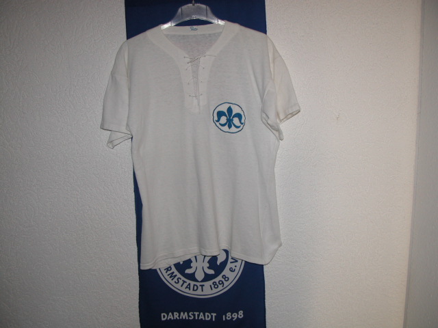 Natürlich sofort Kontaktaufnahme ergriffen und keine Kilometer und Kosten gescheut um das Trikot persönlich abzuholen. Über die Ablöse-/Transfersumme wurde von beiden Seiten Stillschweigen vereinbart. Es war totaler Zufall, dass der Vorbesitzer an meinem Auto vorbei kam. Jedenfalls freut es mich sehr und ich bin so froh, dass Trikot dahin geholt zu haben, wo es hingehört : Nach Darmstadt. Originals Spielertrikot aus den 50'er Jahren - der Vorbesitzer hat es damals als er 16 Jahre alt war, direkt vorm Spieler bekommen. Auf dem Logo von Leuzela ist noch der alte Reichsadler.
