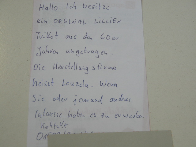 Die Geschichte zum Erwerb dieses Trikots ist mal wieder unglaublich und ein Zufall, der seines gleichen sucht. Als ich am Freitag den 13. (September) nach dem Angeln auf dem Edersee abends zurück am Auto (das durch sein Kennzeichen und diverser Aufkleber leicht als Lilien-Fan Auto zu erkennen ist) war um das ganze Tackle wieder ein zu laden, hing an der Scheibe unter dem Scheibenwischer ein Zettel. Ich dachte "Mist, da hat mich einer auf dem Parkplatz angefahren, naja wenigstens hat er einen Zettel hinterlassen".